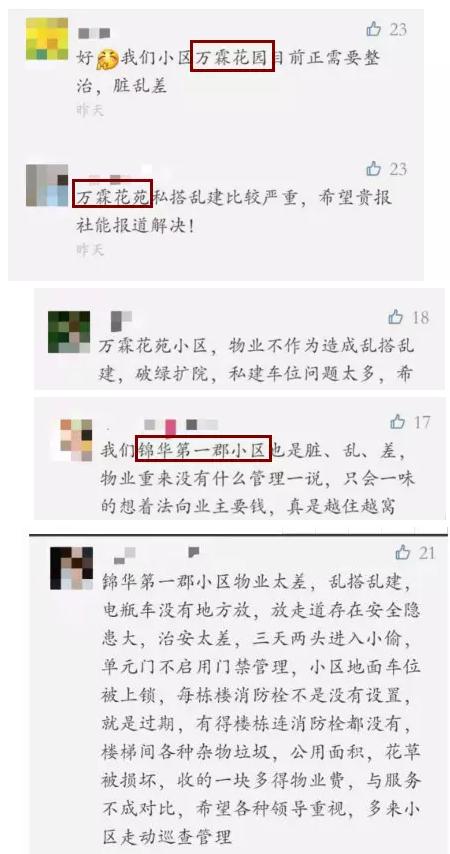 万霖花苑和锦华第一郡,均遭业主投诉:小区环境脏乱差、锦华第一郡电梯经常罢工!万霖花苑私搭乱建现象严重!
