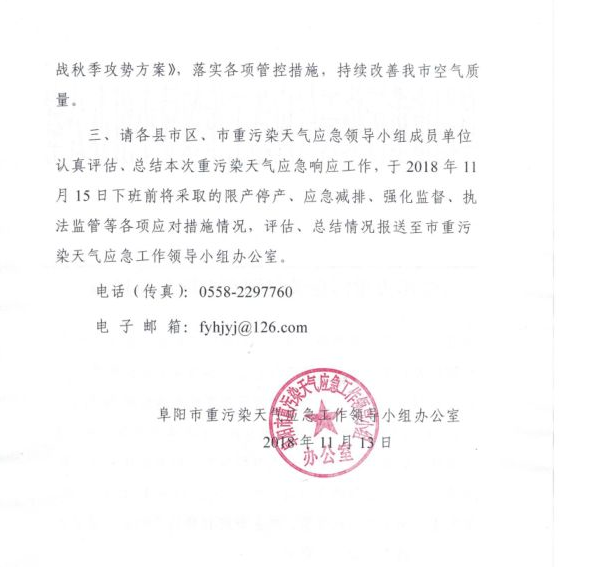根据《安徽省解除重污染天气预警信息通报》(皖气领办〔2018〕6号)精神,经研判我市大气扩散条件转好,空气质量将逐步改善,满足重污染天气橙色预警解除条件。经市重污染天气应急工作领导小组批准,决定自11月13日14时起,解除重污染天气橙色预警,终止市级II级应急响应。