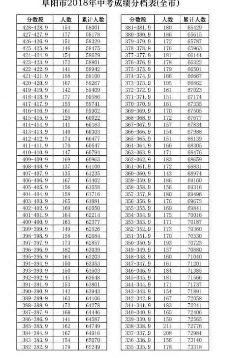阜阳市2018年中考成绩分档表、普通高中招生建档线出炉