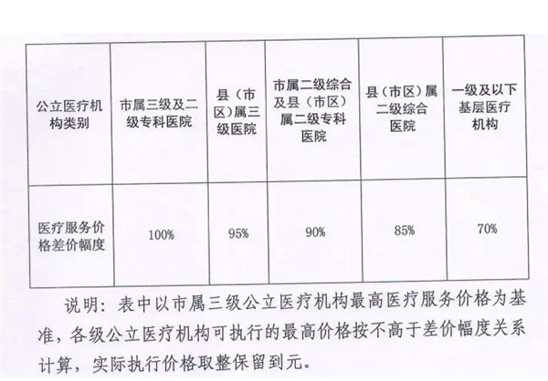 各市、县区、基层公立医疗机构应按照“分等定级”的原则执行此次调整的医疗服务价格。其中三级按100%、二级按90%、一级按85%、其它按80%执行。