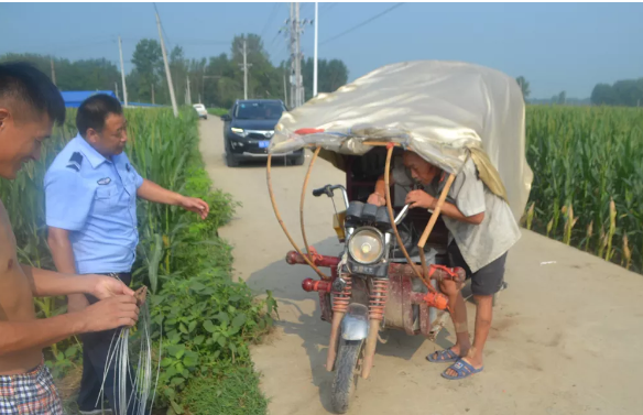 民警立即出警。在现场民警看到老人坐在路边,头部有轻微皮外伤,民警询问老人其他部位有无受伤,并帮老人包扎检查,确定只是头部轻微皮外伤,其他没有受伤。见老人愁眉不展,民警安慰老人:“别担心,我们会把你的车打捞上来的”。原来老人叫王某堂,七十多岁了,系宋集镇王营行政村村民,今天是到滑集镇靳桥行政村李庄去接走亲戚的老伴,在倒车的过程中不小心把车倒进了路边沟里。农村路边沟深斜度大,在民警和过路的村民的共同努力下,把老人的三轮电瓶车推了上来,民警又检查了老人的三轮电瓶车,发现车脚刹摔掉了,不能骑了,民警又手动帮老人把电瓶车修理好,最终民警看着老人骑上电瓶车,老人对民警连声道谢。