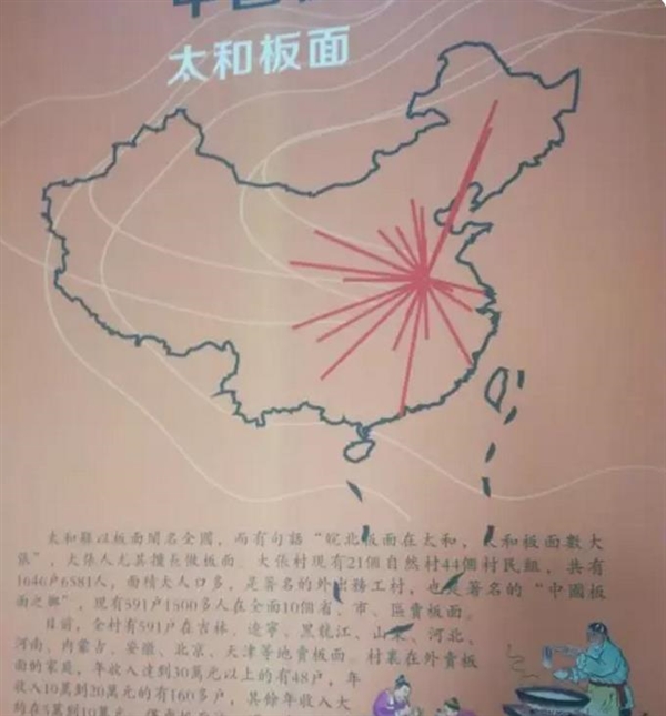 “没有吃过板面,就不算来过太和。”在太和县,说起板面无人不晓。不过在太和还有一种说法:“皖北板面在太和,太和板面数大张”。大张村人自豪地说,太和板面的发源地就在咱村。这个小村庄的1800多户村民中,有